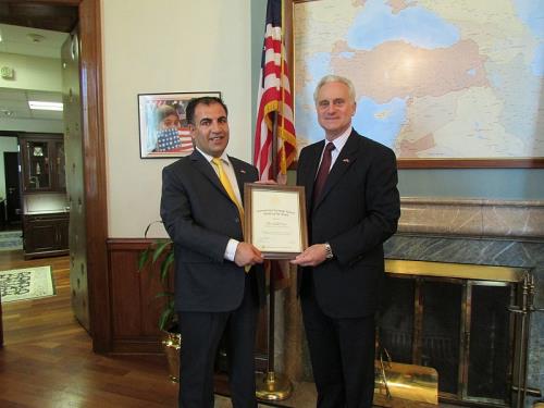 Büyükelçi Ricciardone, Yüce ye ABD Dışişleri Bakanlığı tarafından Gençlik ve Kanser çalışmalarından dolayı yapmış olduğu çalışmalar nedeni ile gönderdikleri teşekkür belgesini Yüce’ye elden teslim etti. Çok başarılı bir görüşme yaptıklarını belirten salih Yüce, çalışmalarımız hakkında bilgi sahibi olan Büyükelçi ile bundan sonra muhtemelen yürütecekleri projeleri konuştuklarını ve kendilerine vermiş oldukları destekten dolayı da Teşekkür etiklerini belirti. Görüşme Salih Yüce’nin 2011 yılında Amerika’da katılmış olduğu çalışma ziyareti programı kapsamında Yılın üyesi seçilmesi nedeni gerçekleşti.