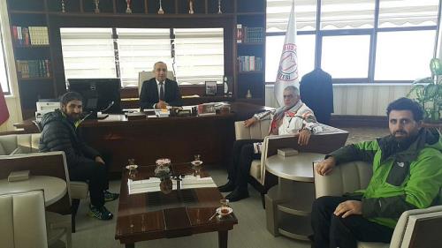 Kayaklı Koşu Milli Takım Baş Antrenörü Sabahattin Oğlago ve Kayak İl Temsilcisi Aydın Koçlardan, Muş Alparslan Üniversitesi (MŞÜ) Rektörü Prof. Dr. Fethi Ahmet Polat´ı ziyaret etti