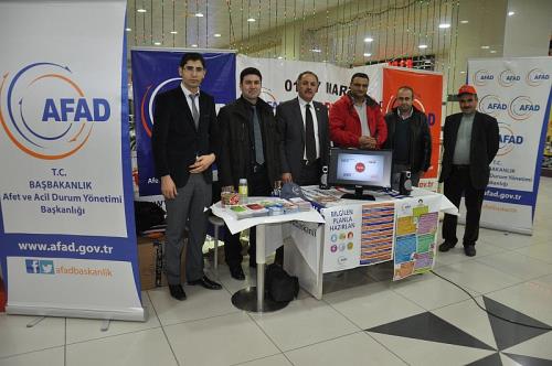 Muş’un en büyük alış veriş merkezi olan Ceylan AVM’de kurulan ‘deprem haftası’ standına İl Afet ve Acil Durum Müdür Vekili Ramazan Aktaş ve AFAD personelleri katıldı. Burada vatandaşlara, ‘Afetler esnasında neler yapmalıyız?’, ‘Afetlerle birlikte yaşamak’, ‘İlk 72 saat’ ve ‘Muş’un deprem haritası’ gibi broşürler dağıtıldı. Kurulan stantlarla vatandaşları bilgilendirmek istediklerini belirten İl Afet ve Acil Durum Müdür Vekili Ramazan Aktaş, okullarda ise çeşitli etkinliklerle birlikte tatbikatlar yapacaklarını söyledi.