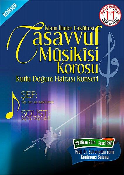 Muş Alparslan Üniversitesi Kutlu Doğum Haftasını Konser Etkinliğiyle Kutluyor. Muş Alparslan Üniversitesi İslami İlimler Fakültesi, Tasavvuf Musikisi Korosu tarafından verilecek konserde Tasavvuf Müziği’nin eşsiz eserleri seslendirilecek. Şefliğini Muş Alparslan Üniversitesi öğretim görevlilerinden Ercihan Ülger`in, solistliğini Arş. Gör. Yalçın Dicle`nin yapacağı konser, bugün saat 19:00`da, Rektörlük Prof. Dr. Sabahattin Zaim Konferans Salonu`nda gerçekleştirilecek.