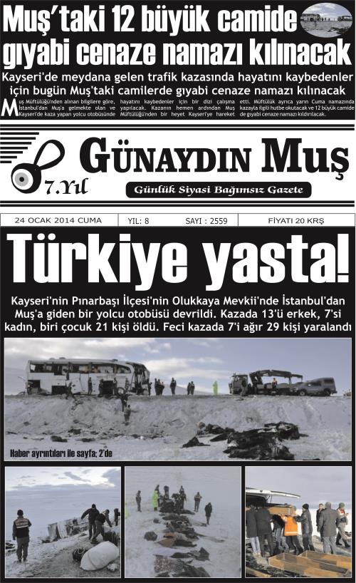 İstanbul`dan Muş`a gelmekte olan yolcu otobüsünün Kayseri`de şarampole yuvarlanması sonucu 21 kişinin öldüğü ve 29 kişinin de yaralandığı trafik kazası tüm Muşluları yasa boğdu. Kentte yayımlanan günlük gazeteler de kazayı siyah zeminde verdi.
