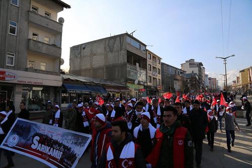 Gençlik Hizmetleri ve Spor İl Müdürlüğü organizasyonu ile binlerce kişi Sarıkamış şehitleri için yürüdü. Düzenlenen saygı yürüyüşü, Hükümet Konağı önünden başlayarak Gençlik Merkezi’ne kadar devam etti. Yürüyüşe Vali Aziz Yıldırım, Garnizon Komutanı Albay Cem Karoğlu, İl Emniyet Müdürü Zafer Aktaş, siyasi parti temsilcileri, kamu kurumu müdürleri ve çok sayıda öğrenci ile binlerce vatandaş katıldı. Ay yıldızlı bayraklarla tamamlanan yürüyüşün ardından şehitlerin ruhu için Kuran-ı Kerim okundu ve dualar edildi. Daha sonra konuşan Vali Aziz Yıldırım, 103 sene evvel gerçekleştirilen Sarıkamış hareketinde binlerce Mehmetçik`in şehit düştüğünü hatırlattı. Vatan, millet savunması için dondurucu soğuğun veya yakıcı sıcağın öneminin olmadığını belirten Vali Aziz Yıldırım, "Hepimiz biliyoruz ki, vatan-millet savunması için soğuğun olması, Sarıkamış`ta, Allahu Ekber Dağları`nda dondurucu soğuğun olması, Yemen çöllerinde yakıcı güneşin olması, hiçbir şeydir. O insanlar da belki biliyorlardı ki, oralarda şehit düşecekler ama gözlerini hiçbir zaman en ufak bir şekilde kırpmadılar, kalplerinde en ufak bir tereddüt olmadı ve hepsi seve, seve vatan-millet için, din-diyanet için, komutanlarının yapmış oldukları savaş planı doğrultusunda o dağlara gitmekten, soğuğa karşı durmaktan çekinmediler ve birçoğu şehit oldu. Her ne kadar bizim Mehmetçik`imiz o soğukta mücadele vermişse, aynı şekilde Çanakkale`de de, Sakarya Meydan Muharebesi`nde de bu mücadeleyi vermekten, şehit olmayı göze almaktan hiçbir zaman çekinmemiştir" dedi.