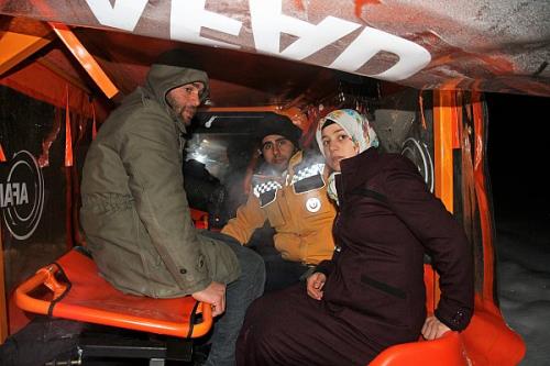 Eşinin 6 aylık hamile olduğunu ve aniden fenalaştığını belirten Selim Alkaş, “Eşim 6 aylık hamile ve nefes darlığı vardı. Aniden sancılarının başladığını söyleyince merkezle görüştük ve doktorun hemen gelmesi gerektiğini söyledi. Bizde bu durum karşısında önce ne yapacağımızı anlayamadık. Bunun için ilk önce 112 ekiplerini aradık ve yolunda kaplaı olduğunu söyledik. Ekipler daha sonra İl Afet ve Acil Durum Müdürlüğü ile irtibata geçerek koordineli olmuşlar. Sonra bizi arayıp ekiplerin geldiğini söylediler. Bizde gerekli hazırlığımızı yaptık beklemeye başladık. Ekipler sürekli bizimle irtibata geçip hasta hakkında bilgi alıyorlardı. Sonra ekiplerin geldiğini fark ettik ve sağ olsunlar geldiler. Yolun kapalı olmasına rağmen gelip hastamızı alan tüm ekiplere ve yetkililere minnettarız. Eşimle birlikte bizi önce arama kurtarma aracıyla 112 Acil servislerine ulaştırdılar ve daha sonra ambulansa yetiştik. Çok şükür şuanda bir sıkıntımız yok. Allah devletimize ve milletimize zeval vermesin. Şu anda herhangi bir sorun yok. Ekiplere teşekkür ediyoruz." diye konuştu.
