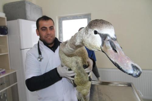 Alınan bilgiye göre, Hasköy kırsalında köylüler, donmak üzereyken buldukları kuğuyu Muş Belediyesi Rehabilitasyon ve Geçici Bakım Evi`ne getirdi. Burada veteriner Semir Türkcan tarafından ilk müdahalesi yapılan ve ilaç verilen kuğunun vücut ısısı normal seviyeye getirildi.