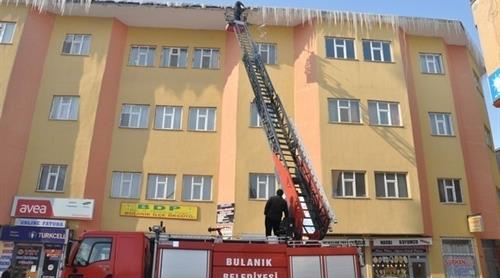 Bulanık Belediyesi itfaiye ekiplerince başlatılan çalışmalarda, saçaklarda oluşan buz kütleleri temizlendi. Soğuk havaların artmasıyla birlikte apartman çatılarında sarkarak tehlike oluşturan buz kitleleri, ekipler tarafından kontrollü bir şekilde kırılarak temizlendi. Yayaların olası bir kazaya maruz kalmaması için önlem alan ekipler, itfaiye merdiveni aracılığıyla metrelerce yükseklikteki çatılardan sarkan bir metrelik buz sarkıntılarını kırarak temizledi. Dondurucu soğuklar nedeniyle çatılarda ani bir şekilde ölümlere yol açabilecek buz sarkıntılarının oluştuğunu dile getiren İtfaiye Amiri Emrah Akkaya, buz sarkıntılarına karşı yayaların dikkatli bir şekilde yürümeleri için uyarıda bulundu. Çarşı merkezinde bulunan bina çatılarında oluşan sarkıntıları belirli aralıklarla temizlediklerini söyleyen Akkaya, her an oluşan bu sarkıntıların görünmez bir kazaya yol açabileceğini belirterek, vatandaşların dikkatli olması gerektiğini söyledi