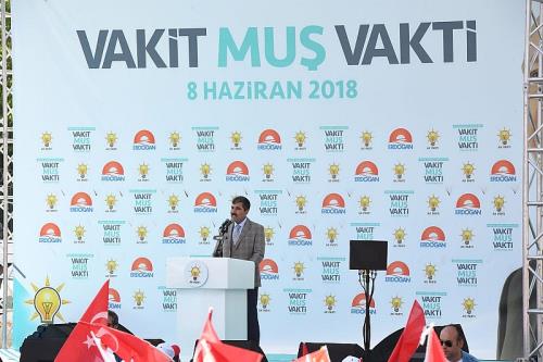 Bizler kendi yerelimizde bu hizmetleri yaparken hükümetimizin güçlülüğüne güvenerek yapıyoruz. Dolayısıyla şimdi güçlü bir meclis, güçlü bir hükümet ve güçlü bir Türkiye için yeni bir sürece girmiş bulunmaktayız. Allah’ın izniyle Muş halkı olarak her zaman olduğu gibi şimdi de yolumuz bellidir. Muş, 24 Haziran’da kendisine yakışanı yapacaktır. Davamızın teşkilatlarımız eliyle her zaman güçlü, genç, dinamik, ataletten akametten uzak, üreten, mücadele eden bir yapıda olması için yenilenmenin elzem olduğu aşikârdır. Bizim için bu davanın her kademesi kutsal, küçük büyük fark etmeksizin her görev önemli ve değerlidir. Hiç kimsenin bu dava ve hareket içerisinde şahsi çıkarlarını önemseyerek davranması, kompleks ve kibre kapılması kabul edilebilir değil bilhassa içinde bulunduğumuz şartlar itibari ile asla tahammül edilemez. Bizler büyük bir zincirin birer halkasıyız, her halka bir diğeri ile varlığını devam ettirmektedir. Bir halkanın zayıflaması veya kırılmasının bütün zincirin kuvvetini etkileyeceğini unutmamalıyız. Bizler, birbirimizden güç almaktayız. Bizim için görevin bitmesi diye bir şey söz konusu değildir. Görev ve dava şuurumuz her zaman devam edecektir. Bu vesile ile bir kez daha teşrifleri ile bizleri onurlandıran Başbakanımız ve beraberindeki heyete şükranlarımı arz ederken, 24 Haziran’da yapılacak olan Cumhurbaşkanlığı ve 27. Dönem Milletvekili seçimlerinin özelde ilimize ve bölgemize, genelde ülkemize hayırlar getirmesini Yüce Allah’tan niyaz ederim.”