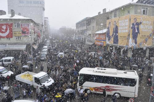 Coşkunun yüksek olduğu beldede konuşan Demirtaş, “30 Mart’ta AKP’ye tek bir belediye vermeyelim. AKP Muş’ta kapanmalıdır” diye konuştu. Ardından konvoylar eşliğinde Muş’a doğru hareket edildi. Binlerce araçlık konvoyla Muş’a giriş yapılırken, vatandaşlar yol boyunca korna çaldı. İl girişinde vatandaşlar konvoyu zafer işaretleri ile karşılarken yoğun kar yağışına rağmen miting alanını 15 bin kişi doldurdu.