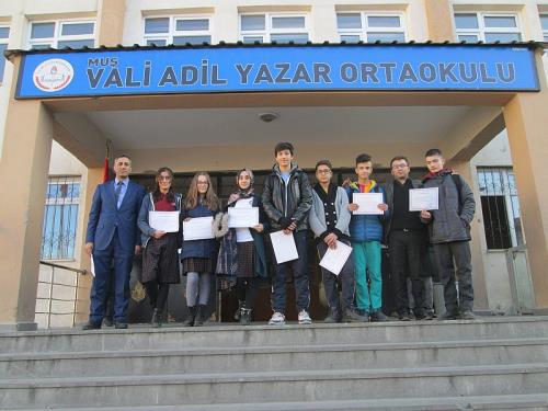 2016-2017 Eğitim-Öğretim yılı 8. sınıf Ortak Sınavının sonuçları açıklandı. Yerleştirmeye Esas Puan (YEP) sonuçlarına göre Muş’ta ilk 3 öğrenci Merkez Vali Adil Yazar Ortaokulu’ndan çıktı. Vali Adil Yazar Ortaokulu öğrencisi Hayrun Nisa Bingöl, her iki ortak sınavda da tüm soruları doğru cevaplayarak 499.94 Yerleştirmeye Esas Puanı (YEP) ile İl birincisi, Nursenem Çelik 498,93 puanla il 2.si ve Hazal Yaren Yılmaz ise 498,91 puanla il 3.sü oldu. Her yıl rekorlar kırarak başarı çıtasını sürekli yükselten ve ileriye taşıyan Vali Adil Yazar Ortaokulu açıklanan resmi sonuçlara göre yine Muş’un gururu oldu.