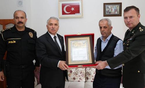 Vali Aziz Yıldırım, burada bir konuşma yaparak tüm şehitlere rahmet dileğinde bulundu. Şehitlik makamının önemine değinen Vali Yıldırım, “Şehadet mertebesi mertebelerin en üstündedir. Tüm şehitlerimizin mekânları cennettir, rabbim onları cennetinde misafir ediyor. Sizlere de onların şefaatleri yetişecektir. Sizlere rabbim hayırlı uzun ömürler ve hayırlı sabırlar nasip etsin. Onlar bizim gönlümüzde her zaman en iyi yere sahiptirler. Sizler bizlere şehidimizin emanetlerisiniz. Bu belgede hepimizin gururudur. Bu Şehadet Belgesini sizlere tevdi ediyorum. Sizlere her zaman kapımız ve gönlümüz açıktır bunu asla unutmayın” dedi.