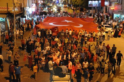 Öte yandan belediye meydanında toplanan binlerce vatandaş, dev ay yıldızlı bayrakla Valilik önüne kadar yürüyerek burada toplanıp demokrasi nöbeti için beklemeye başladı.