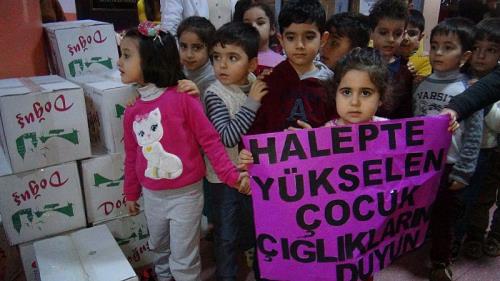 Merkez Gökkuşağı Anaokulu idaresi ve öğrencileri tarafından başlatılan ‘Halep’te çocuklar ölmesin’ yardım kampanyası sona erdi. Kampanya kapsamında öğrenci velileri ve duyarlı vatandaşların da desteğiyle kuru gıda, un, atkı, eldiven, bere ve çeşitli muhtelif yaşam malzemesi toplandı. Öğretmen ve öğrenciler tarafından koliler haline getirilen yardım malzemeleri İnsani Yardım Vakfı (İHH) aracılığıyla Halep’e ulaştırılacağı belirtildi.