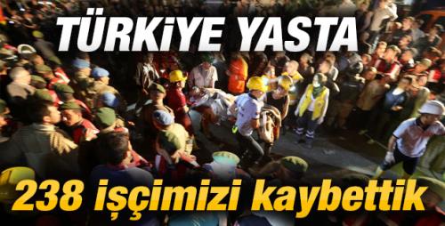 Başbakan Erdoğan, "Yakın tarihimizin en büyük iş kazalarından birine şahit olduk. İlk belirmelere göre 238 işçimizi Hak`ka uğurladık. İlk belirlemelere göre 80 işçimizi yaralı olarak kurtardık. 19’u şu an itibarıyla taburcu oldu. Ağır yaralı işçimiz kalmadı. Rabbim hayatını kaybeden kardeşlerimizi rahmetiyle kuşatsın" dedi.