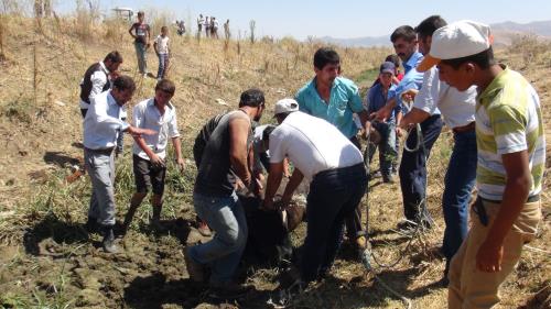 Muş´ta daha önce kazılan ve bataklığa dönüşen kanala saplanan büyükbaş hayvanlar için köylüler adeta seferber oldu