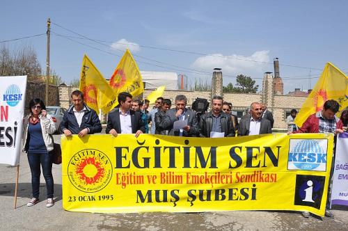 Kamu Emekçileri Sendikaları Konfederasyonu (KESK) Muş Şubeler Platformu üyeleri, sendika üyelerinin tutuklanmalarına tepki gösterdi. Belediye Meydanı’nda bir araya gelen sendika üyeleri adına açıklama yapan KESK Muş Şubeler Platformu Dönem Sözcüsü Tekin Uygun, “AKP iktidarı her dönem yeni bir “düşman” icat ederek bir yandan mağdurları oynayıp kitle tabanını korumaya, genişletmeye çalışırken bir yandan da yeni saldırı dalgalarına meşru zemin oluşturmak istemektedir. “Yeni düşman” kim olursa olsun AKP’nin muhafazakâr, neo liberal ve faşizan politikalarına muhalefet eden bizler her dönem baskılardan, saldırılardan, gözaltı ve tutuklamalardan nasibimizi aldık, alıyoruz. Ne zaman kamu emekçilerinin hakları gasp edilecekse KESK’e yönelik itibarsızlaştırma operasyonları için düğmeye basıldı, basılmaktadır. Çağdışı gerici 4+4+4’e karşı çıktığımız, parasız, bilimsel, demokratik, anadilinde eğitim talep etiğimiz için “terörist” ilan edildik, hedef tahtasına konulduk. İş güvencemizi ortadan kaldırmayı ve performansa dayalı ücretlendirmeyi öngören 657 sayılı DMK’da değişikliklerin gündeme getirildiği bir süreçte, KESK olarak iş güvencemizden taviz vermeyeceğimizi, sendikal hak ve özgürlüklerimizin daha da daraltılmasına izin vermeyeceğimizi söylediğimiz için “eş zamanlı” operasyonlarla sindirilmeye çalışıldık. Sömürü ve yağmaya karşı emeğin hakkını, savaşa karşı barışı, ırkçılığa ve şovenizme karşı hakların kardeşliğini kararlılıkla savunduğumuz için krimanilize edilmek istendik.” Dedi.