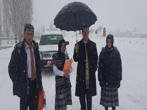 Muş´ta etkili olan kar yağışı nedeniyle incelemelerde bulunmak üzere yola çıkan Vali Vedat Büyükersoy, yolda pansiyonlarına gitmek üzere araç bekleyen lise öğrencilerle bir araya gelerek onları pansiyonlarına ulaştırmak için gerekli talimatlar verdi