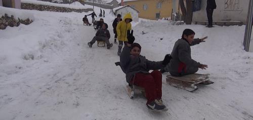 Etkili olan kar yağışından sonra bastıran soğuk havaya aldırmayan köy çocukları, kendi imkanlarıyla korniş ve hortumlardan tasarladıkları kızaklarla kayarak doyasıya eğleniyorlar