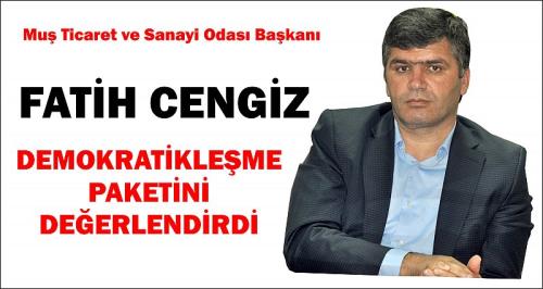 Muş Ticaret ve Sanayi Odası Başkanı Fatih Cengiz, demokratikleşme paketini Türkiye demokrasisi bakımından önemli bir adım olarak değerlendirirken, eksikliklerinin ise ilerleyen süreçte hazırlanacak paketlerle giderileceğine inandığını belirtti. Geçmişte büyük sıkıntılara ve mağduriyetlere sebep olan önemli konuların bu paketle bir nebze de olsa çözüme kavuşmasını umut ettiklerini ifade eden Cengiz, "Bu paket yetersiz görülebilir ancak değerlendirme yaparken iyi niyetli yaklaşım gösterilmeli, paketteki olumlu adımlar göz ardı edilmemelidir" dedi.