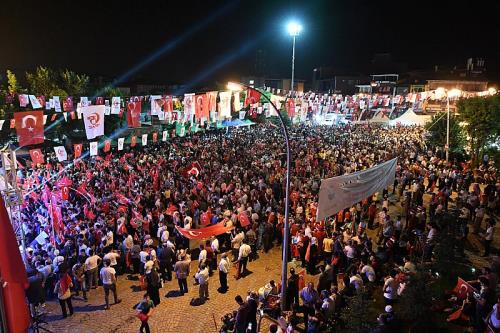Programda halka hitap eden Belediye Başkanı Feyat Asya ise “Bugün zulmün helakına şahitlik ettiğimiz bir gün. Ve bugün artık hiçbir şeyin dün gibi olmayacağı, yarını aydınlık, yarını özgürlük ve yarını inananların olacağı Bir gün. Geçen yıl bugün, 15 Temmuz akşamı, bu ülkenin geleceğine kast edildi. Bir grup hain bu ülkenin onurlu halkına kurşun sıktı. Her şeyi kendilerince hesap etmişlerdi ancak Allah’ın hesabını düşünememiştiler. Bu aziz milletin göğsünü tanklara toplara siper edeceğini hesaba katmamıştılar. Bu topraklarda yaşayanlar olarak o gece el ele verdik, gönül gönüle verdik ve hep beraber bir tarih yazdık. Bizleri muvaffak eden Allah’a binlerce şükürler olsun. 15 Temmuz akşamı, bu toprakların tarihini, bu toprakların yiğit ve yürekli halkı yeniden yazdı. Her on yılda bir, ruhunu şeytana satmış uğursuz ve onursuz darbecilerin hakaretlerine, işkencelerine, cinayetlerine ve zulümlerine maruz kalan halkımızın onurlu ve yürekli evlatları olarak, imansız ve izansız cuntacılara geçit vermedik. Milletimiz, korkusuzca zorbalara, alçaklara, kalleşlere karşı dimdik durarak direndi. Onların o kirli emellerine ulaşmalarına imkan ve fırsat vermedi” dedi.