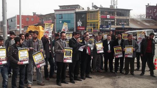 Muş’ta faaliyet gösteren Anadolu Gençlik Derneği, Has-Der, Lale-Der, Eğitim-Bir Sen, Hira-Der, Muş İHH, Sağlık-Sen, Memur-Sen ve Diyanet-Sen Suriye’de yaşanan olaylara yönelik ortak bir basın açıklaması yaptı. Belediye meydanında bir araya gelen sivil toplum kuruluşları temsilcileri ve üyeleri “Esed Diktasına hayır, Katil Esad oğlu Esad” gibi sloganlar attılar. Gerçekleştirilen ortak basın açıklamasının metnini Memur Sen Şube Başkanı Feyat Asya yaptı. Asya, şunları söyledi: “Yarım asra yakın bir zamandır devam eden diktatör yönetimlerin baskısı altında yaşayan Müslüman halkların başkaldırısı en son Suriye direnişiyle yeni bir boyut aldı. Suriye halkının zorba ve Batı destekli Baas rejimine karşı kıyamı 3. yılına girmiştir. Bugüne kadar yaşanan zulümler bütün dünyanın gözü önünde cereyan etmektedir. Mali’ye bir gün bile tahammül edemeyen Batılıların Suriye konusundaki sessizliği ısrarla sürdürmesinin tek açıklaması var, o da Mali’de elden giden sömürgedir. Suriye’de geçen her gün katledilen yüzlerce insan Batının sadece sevincini artırmaktadır.
