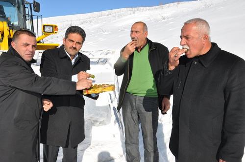 Güvenlik yolunda karla mücadele çalışmalarını sürdüren ekip ile bir araya gelen İl Genel Meclis Üyeleri iş makinesi operatörlerine tatlı ikramında bulundular.