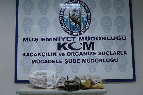 İl Emniyet Müdürlüğü`nden yapılan açıklamada; Kaçakçılık ve Organize Suçlarla Mücadele Şube Müdürlüğü görevlilerince, Muş gelinde gümrük kaçağı sigara ve uyuşturucu madde üreten, satan, aracılık eden şebeke ve şahıslara yönelik başlatılan operasyonların sürdürüldüğü belirtildi. Açıklamada, "Yapılan kontrollerde durdurulan yolcu otobüsünde yolculuk yapmakta olan şüpheli C.O. isimli şahsa ait telis çuval incelendiğinde; içerisinde bulunan pirinç çuvalı, hurma kutusu ve otlu peynir içerisine gizlenmiş vaziyette toplam 3 kilo 164 gram eroin maddesi ile 208 gram afyon sakızı ele geçirilmiştir. Uyuşturucu Madde Ticareti Yapmak suçundan yakalanan C.O. isimli şahıs, adli mercilere sevk edilmiş ve çıkarılmış olduğu mahkemece tutuklanarak cezaevine gönderilmiştir. Aynı şekilde yapılan yol kontrolleri sırasında durdurulan hurda yüklü bir araçta, hurda malzemelerin arasına gizlenmiş vaziyette piyasa değeri 500 bin TL olan toplam 120 bin 500 paket bandrolsüz gümrük kaçağı sigara ele geçirilmiştir. Olayla ilgili yakalanan 2 şahıs hakkında 5607 SKM suçu kapsamında adli işlem yapılmıştır" denildi.