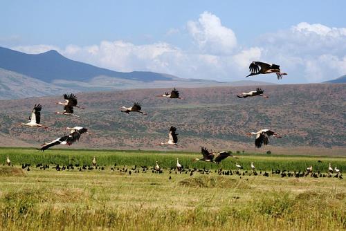 Baharın müjdecisi olarak bilinen ve soğuk hava nedeniyle başka bölgelere göç eden leylekler, Muş`a gelmeye başladı