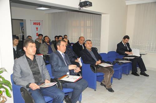 Meclis Toplantı Salonunda yapılan toplantıya İŞKUR Muş İl Müdürü Mehmet Emin Taylan, MUŞ TSO Yönetim Kurulu Üyesi Mustafa Şentürk, MUŞ TSO Meclis Üyesi Abdulkadir Yalçın ve işverenler katıldı. Programın açılış konuşmasını yapan İŞKUR Muş İl Müdürü Mehmet Emin Taylan, İŞKUR’un yapmış olduğu projeleri anlattı. Taylan iş güvenliği analizi ile ilgili uyarılarda bulunarak işverenlerin yasanın belirlediği kriterlere uymaları gerektiğini ifade etti. Daha sonra İŞKUR Muş İl Müdürlüğü uzmanları iş sağlığı ve iş güvenliği konularında işverenleri bilgilendirdi.
