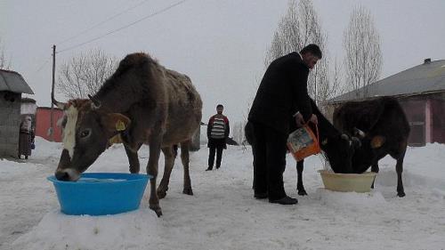 Günde bir ya da iki defa hayvanlara su verdiklerini ve perişan halde olduklarını kaydeden Vahiyettin Karasu ise, “Kışın bizim buralar gördüğünüz gibi, her taraf buz kesilmiş. Günde iki kez hayvanlarımıza su veriyoruz. Sularımız hepsi donmuş. Karasu da donmuş. Kışın böyle perişan haldeyiz biz. Tulumbayla kuyudan çekiyoruz günde iki kez. Leğende su veriyoruz hayvanlara. Kışın perişan haldeyiz yani. Şu anda 50 gün soğuk çeker, 3-4 ay karın altındayız böyle. Sularımız zaten kesilmiş, buz tutmuş halde” diye konuştu.