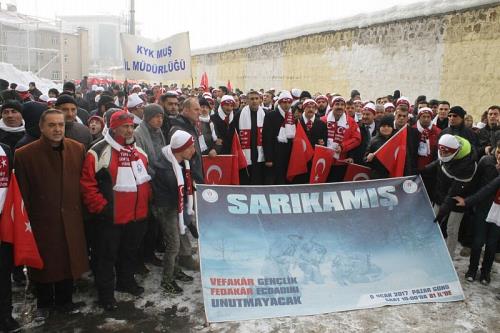 Muş´ta Sarıkamış şehitlerinin 102. yılı nedeniyle Muş Valiliği önünde toplanan binlerce kişi, Gençlik Hizmetleri ve Spor İl Müdürlüğü binasına kadar yürüyüş yaptı