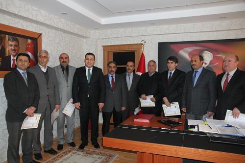 Kaymakam Tahir Şahin, Milli Eğitim Müdürü Basri Avcı ile birlikte merkezde faaliyetlerine devam eden 8 okul müdürüne göstermiş oldukları performans ve çalışmalarından dolayı başarı belgesi vererek kendilerini daha fazla çalışmaları konusunda uyararak takdir etti.