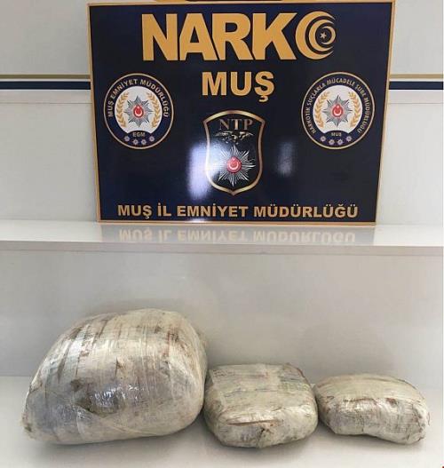 İl Emniyet Müdürlüğü ekipleri, uyuşturucuya geçit vermiyor. Valilikten yapılan açıklamada: “Muş İl Emniyet Müdürlüğü ekiplerince Uyuşturucu ile mücadele kapsamında, narkotik madde ticareti yapan şahıslara yönelik çalışma yapılmıştır. Yapılan çalışmalarda çevre illerden ilimize uyuşturucu madde getirdiği tespit edilen iki kişi yapılan takip sonucu ilimiz Hasköy ilçesinde kullandıkları araçla birlikte yakalanmışlardır. Araçta yapılan aramada aracın motor bölümüne gizlenmiş vaziyette 3 parça halinde toplam ağırlığı 8.638 gr toz esrar maddesi ele geçirilmiştir.