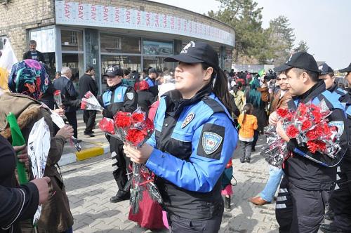 Muş Emniyet Müdürlüğü Toplum Destekli Polislik Şubesine bağlı polis memurları, geniş güvenlik önlemlerinin alındığı basın açıklamasından sonra belediye meydanında ayrılan kadınlara karanfil dağıttı. Polisin kadınlara karanfil dağıtması ise kadınların yoğun ilgisini çekti.
