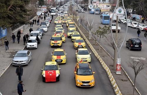 Muş’ta taksiciler, Türk Silahlı Kuvvetleri (TSK) tarafından Suriye`nin Afrin bölgesinde PKK, PYD/YPG ve DEAŞ terör örgütlerine karşı başlatılan ‘Zeytin Dalı Harekatı’na destek amacıyla şehir merkezinde bir kortej oluşturup kornalar çalıp seslerini duyurmaya çalıştılar