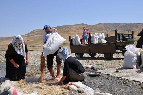 Birçok çiftçi, kış hazırlığı kapsamında unluk buğdayları yıkamaya başladı. Bulanık’ın Arakonak köyündeki vatandaşlar, köyün deresinde yıkadıkları buğdayları geniş örtülerin üzerinde kurutuyor. Kış hazırlığı yapan çiftçilerden Seyithan Temeken, her sene 300 teneke yani yaklaşık 5,5 ton buğday yıkadıklarını söyledi.