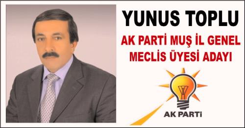 Yıllarca Muş´un köylerinde yaşayan halkın sorunlarını merkeze taşıyıp yöre halkının dertlerine çare olan Yunus Toplu, bu dönem Ak Parti İl Genel Meclisi ile seçimlere katılıyor