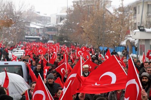 Dev ay yıldızlı bayrakların açıldığı, ‘kahrolsun PKK’, ‘şehitler ölmez, vatan bölünmez’ ve ‘polise uzanan eller kırılsın’ sloganlarının atılmasıyla birlikte yürüyüş düzenlendi. Yürüyüşten sonra binlerce vatandaş İlçe Kaymakamlığı önünde toplandı. Burada İlçe Merkez Camii İmamı Halit Aydın’ın okuduğu dua ile şehitler anıldı.