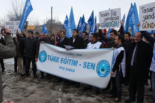 Türk Eğitim Sen Muş Şubesi üyeleri, Milli Eğitim Bakanlığı’nın yasa tasarısını protesto ederek “bu yasa tasarısının çok tehlikeli olduğunu anlatmamıza, komisyonda sakıncalarını bir bir dile getirmemize, değiştirilmesi gereken hususları gündeme taşımamıza rağmen Hükümet yine bildiğini okudu” açıklaması yaptı
