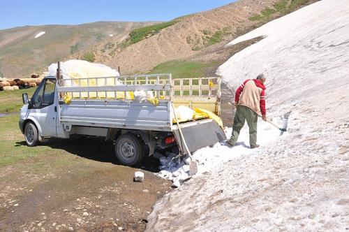 Muş’ta bazı vatandaşlar, 2 bin 500 rakımlı Kurtik Dağı’ndaki obruklardan ve güneş görmeyen bölgelerde topladıkları karları kamyonetlerle şehir merkezine getiriyor. Dağlardan getirdikleri karın poşetini 1 liraya satan vatandaşlar, böylece Ramazan süresince aile bütçelerine katkı sunuyor. Kamyonetle getirdiği karları şehir merkezinde satan Ebedin Erboğa, her yıl Ramazan ayında 2500 rakımlı yüksekliğindeki Kurtik Dağı’na çıkarak kalıplar halinde kar çıkartarak sattığını söyledi.