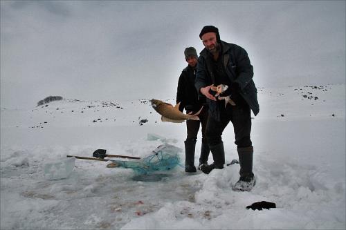 Dondurucu havaya rağmen balık tutkusundan vazgeçmeyen balıkçılar, Varto ilçesine 41 kilometre uzaklıktaki 2 bin 149 rakımlı Hamurpet Gölünün yolunu tuttu. Kalınlığı 30 ile 40 santimetreyi bulan buz tabakasını motorlu testere ve kürek yardımıyla buzda delik açan balıkçılar buz gibi sulara ağlarını bırakıyorlar. Attıkları ağları bir gün sonra çeken balıkçılar, avladıkları kilolarca şehirde satıyorlar. Geçimlerini bu yolla sağlayan balıkçılar yollarının açık olması halinde göle her gün gelerek balık avladıklarını söylediler.