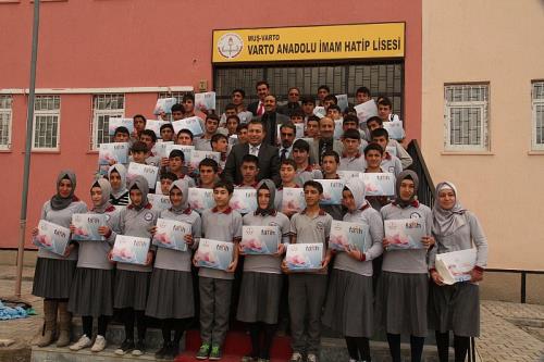 Varto’da pilot okul olarak seçilen Varto Anadolu İmam Hatip Lisesi`nde 160 öğrenciye düzenlenen törenle tablet bilgisayarlar dağıtıldı. Düzenlenen tabet bilgisayar dağıtım törenine Kaymakamı Tahir Şahin, İlçe Milli Eğitim Müdürü Basri Avcı, Şube Müdürü Abdulnasır Sever ve okul müdürü Abdulhalik Sever ile okul idarecileri ve öğretmenler katıldı. Fatih Projesi`nin mimarı Başbakan Recep Tayyip Erdoğan`a teşekkür ederek konuşmasına başlayan Varto Kaymakamı Tahir Şahin, 160 öğrenciye tablet bilgisayar dağıtımının gerçekleştirileceğini ifade etti. `Fatih Projesi` ile öğrencilerin bilişim ve bilgi otoyollarında son hızla ilerleyeceğini belirterek öğrencilerle yakından ilgilenerek Kaymakam Şahin, “Varto Anadolu İmam Hatip Lisemizde Fatih Projesi kapmasında öğretmenlerimize tablet bilgisayarlarının dağıtımını yaptık. Bugünde 160 öğrencimize tablet dağıtılacaktır. Başlangıç olarak Anadolu İmam Hatip Lisesi öğrencileri tablet ve Fatih Projesi eşliğinde eğitim ve öğretimlerine devam edeceklerdir. Projenin mimari olan Sayın Başbakanımıza şükranlarımızı sunuyoruz. Dağıtılan bilgisayarlarla ülkemizin gelişimi açısından geldiği noktanın çok net göründüğü ortadadır. Bu bilgisayarlar hem eğitime destek sağlayacak hem de bilişim ve bilgi otoyollarında son hızla ilerleyeceğiz” dedi.
