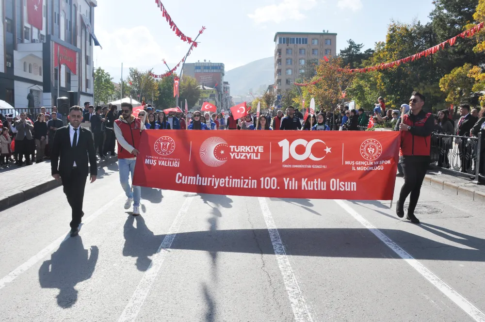 Muş Belediyesi önünde bir araya gelen yüzlerce kişi, Türk bayrağı ve meşalelerle İstasyon Caddesi'nden eski Valilik önüne kadar yürüyerek Cumhuriyet'in 100. yılını kutladı.