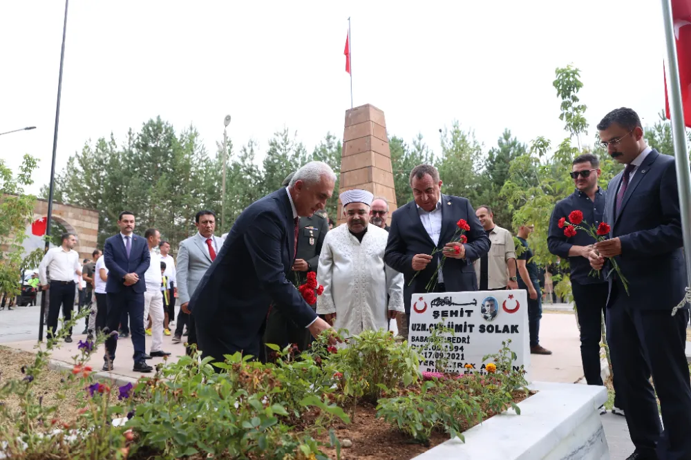 Mevlit programının ardından Muş Valisi Avni Çakır, beraberindeki heyetle Merkez Şehitliğinde düzenlenen törene katıldı. Kur’an-ı Kerim’in okunduğu şehitlik ziyaretinde dualar edilerek şehitlerin kabrine karanfil bırakıldı.