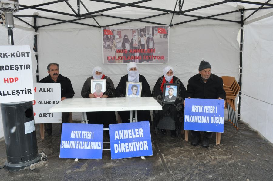 Muş’ta Halkların Demokratik Partisi (HDP) İl Başkanlığı önünde evlat nöbeti tutan aileler çocuklarına kavuşmak için başlattıkları eylemlerini soğuk ve yağışlı havaya rağmen sürdürdüler.