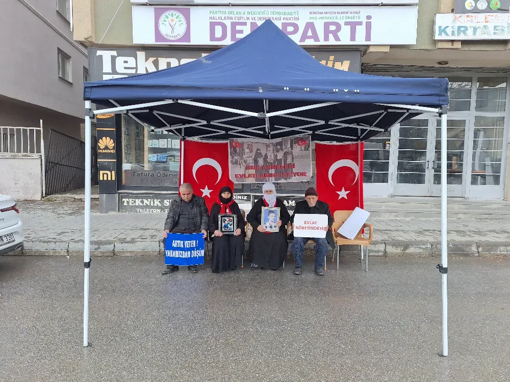 Muş’ta çocuklarının dağa götürüldüğünü iddia eden aileler, DEM Parti İl Başkanlığı önündeki evlat nöbetini kararlılıkla sürdürüyor. Aileler, yıllardır haber alamadıkları çocuklarına bir kez daha “teslim ol, geri dön” çağrısı yaptı.
