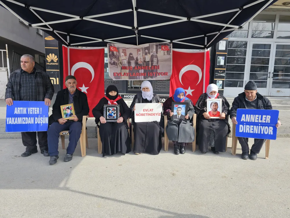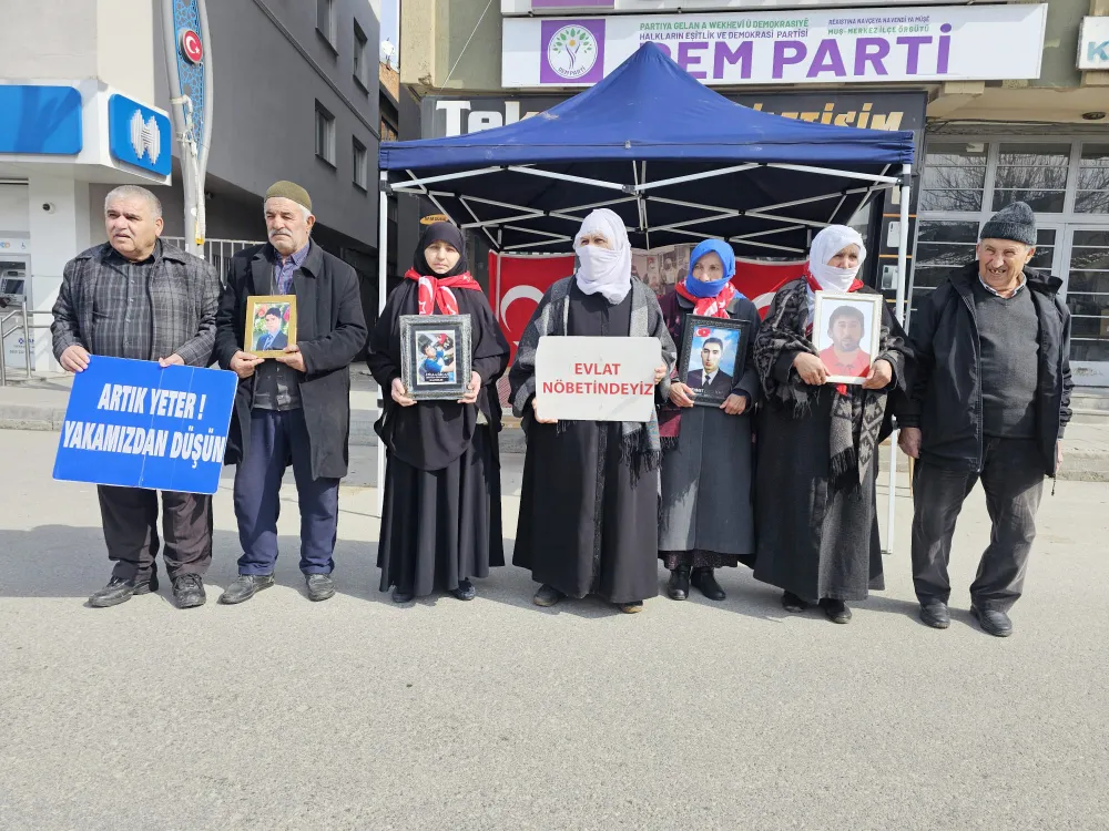 Muş’ta çocuklarının PKK tarafından kaçırıldığını iddia eden aileler, DEM Parti İl Başkanlığı binası önünde sürdürdükleri evlat nöbetine bu hafta da devam etti. Ellerinde çocuklarının fotoğraflarıyla toplanan aileler, yıllardır haber alamadıkları evlatlarına teslim olmaları ve ailelerine geri dönmeleri çağrısında bulundu.
