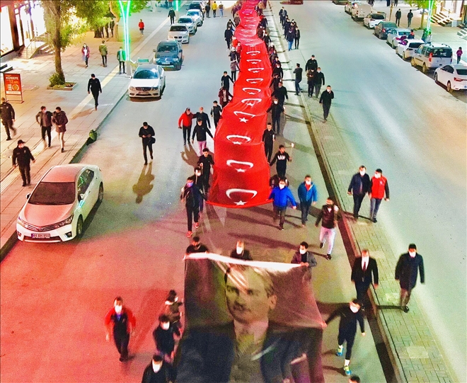 Saat 19.38´de Atatürk Caddesi üzerinde düzenlenen yürüyüşte 82m uzunluğundaki Türk bayrağı ile Atatürk posterleri meşaleler eşliğinde taşındı.