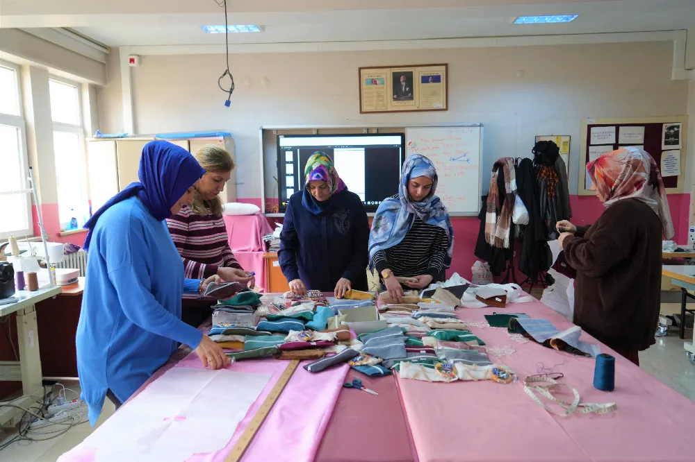 Halk Eğitim Merkezinde verilen el sanatları teknoloji kursuna katılan kadınlar, eğitimlerde kullanılan kumaşlardan arta kalan atıkları değerlendirmek amacıyla kalemlikler üretiyor. Gönüllü olarak yürüttükleri sosyal sorumluluk çalışması kapsamında hazırladıkları kalemlikleri köy okulundaki öğrencilere hediye eden kursiyerler, çocuklara sürpriz yapmak için kalemliklerin içine küçük hediyeler de yerleştiriyor. Kursiyer kadınlar, hem atık malzemeleri geri dönüştürerek ekonomiye katkı sağlamayı hem de çocukların yüzünü güldürmeyi amaçlıyorlar.