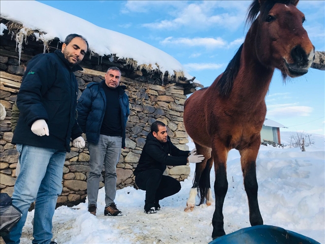 İl Özel İdaresi ekiplerinin karla kaplı yolu açtıkları köye gönderilen veteriner hekimler tarafından muayene edilen at, Van 100´üncü Yıl Üniversitesi Veteriner Fakültesi´ne gönderilecek.