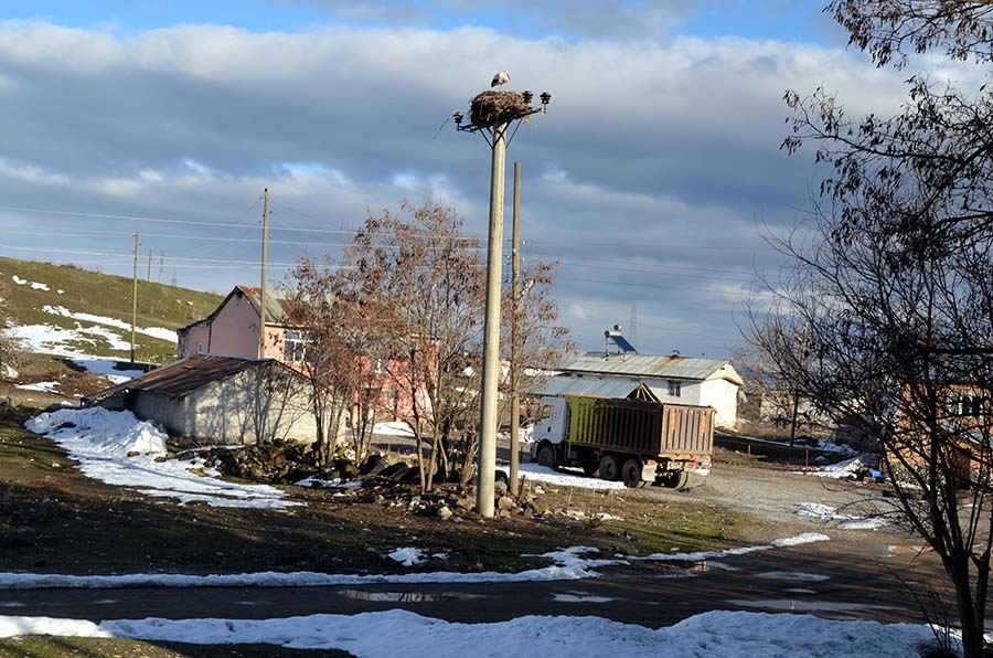 Karla kaplı Muş'a bu yıl erken gelen leylekler, yuvalarına yerleşti.
