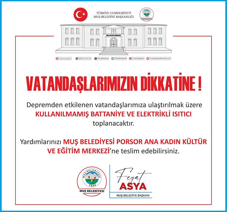 Kahramanmaraş merkezli 10 ilde meydana gelen deprem sonrasında, Muş Belediyesi seferber olarak yardım kampanyası başlattı. Deprem bölgesine yardım göndermek için vatandaşları tek yürek olmaya davet eden Belediye Başkanı Feyat Asya, kullanılmamış battaniye ve ısıtıcı toplamak için vatandaşlara destek çağrısında bulundu.